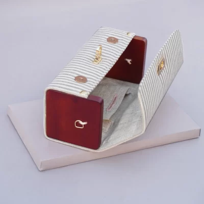 This Rectangular Khadi Bag is a slow fashion handcrafted accessory for your everyday carry. It is made of hand-spun/hand-woven organic cotton and finished with wood and elegant hardware that compliments your casual as well as fusion wear. It comes with two detachable belts – a cotton strap made from the same fabric and a metal chain to style it as a Shoulder or a Cross Body Accessory. You can also give it for an easy wash (Dry clean only).