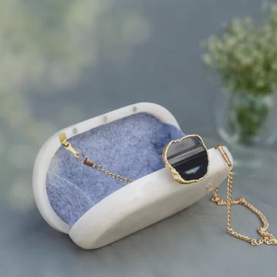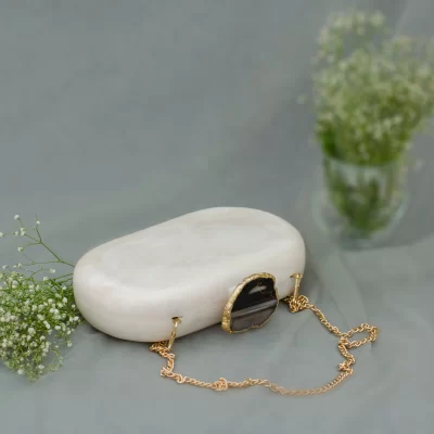 Classic and Timeless designs that you can cherish forever! This Clutch is made of White Corian Marble – an heirloom piece that you can pass it on from generation to generation to keep the bond alive. Express yourself with this edgy Corian Clutch, handcrafted with agate stones that are irreplaceable for its natural shape and texture. It can be a perfect evening accessory to style your festive as well as your party looks and comes with a golden Sling. The Agate stone can vary in shape and color as it is a natural stone.