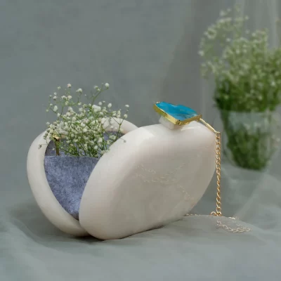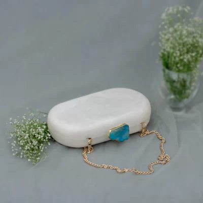 Classic and Timeless designs that you can cherish forever! This Clutch is made of White Corian Marble – an heirloom piece that you can pass it on from generation to generation to keep the bond alive. Express yourself with this edgy Corian Clutch, handcrafted with agate stones that are irreplaceable for its natural shape and texture. It can be a perfect evening accessory to style your festive as well as your party looks and comes with a golden Sling. The Agate stone can vary in shape and color as it is a natural stone.