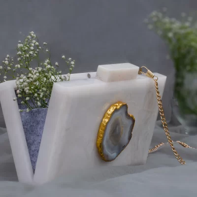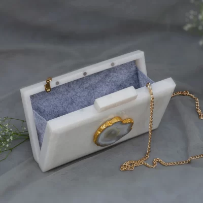 Classic and Timeless designs that you can cherish forever! This Clutch is made of White Corian Marble – an heirloom piece that you can pass it on from generation to generation to keep the bond alive. Express yourself with this edgy Corian Clutch, handcrafted with agate stones that are irreplaceable for its natural shape and texture. It can be a perfect evening accessory to style your festive as well as your party looks and comes with a golden Sling. The Agate stone can vary in shape and color as it is a natural stone.