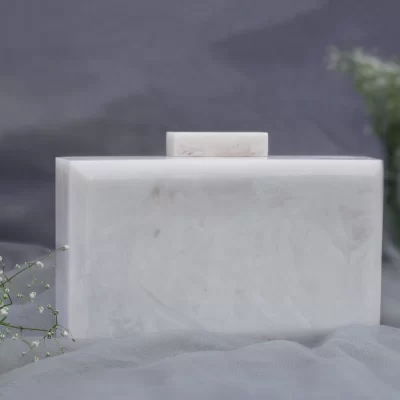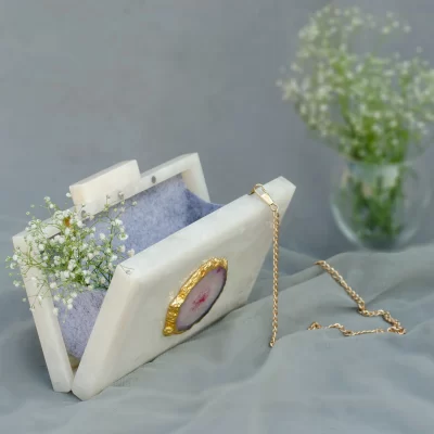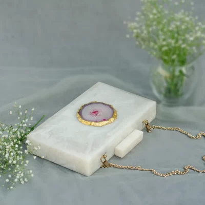 Classic and Timeless designs that you can cherish forever! This Clutch is made of White Corian Marble – an heirloom piece that you can pass it on from generation to generation to keep the bond alive. Express yourself with this edgy Corian Clutch, handcrafted with agate stones that are irreplaceable for its natural shape and texture. It can be a perfect evening accessory to style your festive as well as your party looks and comes with a golden Sling. The Agate stone can vary in shape and color as it is a natural stone.